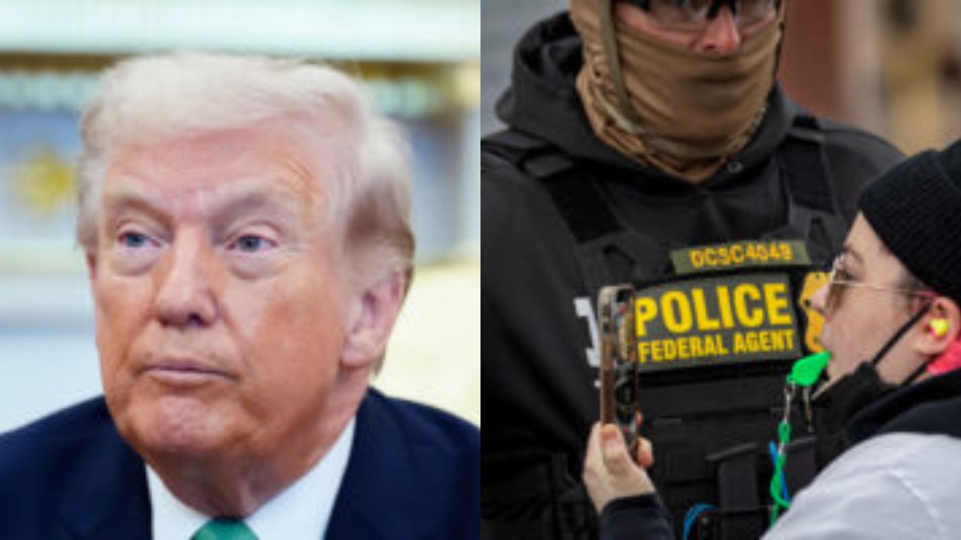 LEFT: Donald Trump (AP Photo/Alex Brandon) RIGHT: ICE agent (Photo by Michael Nigro/Sipa USA)(Sipa via AP Images)