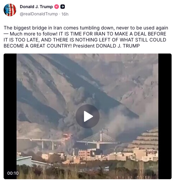 The comments came hours after Trump shared footage of an airstrike on a newly constructed bridge that was set to open to traffic later in the year, writing: “the biggest bridge in Iran comes tumbling down, never to be used again – Much more to follow!”