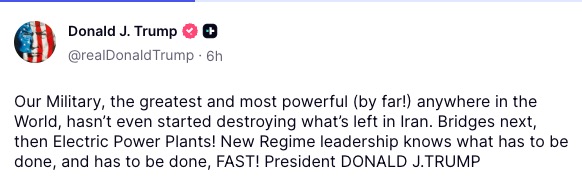 Our Military, the greatest and most powerful (by far!) anywhere in the World, hasn’t even started destroying what’s left in Iran. Bridges next, then Electric Power Plants! New Regime leadership knows what has to be done, and has to be done, FAST! President DONALD J.TRUMP