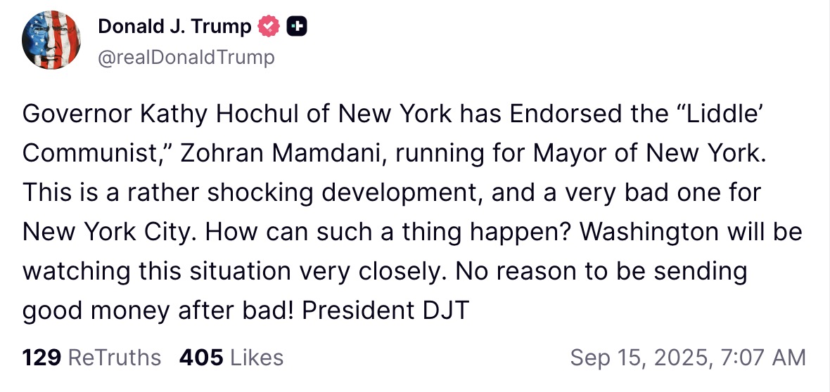 Mocking Mamdani as the “‘Liddle’ Communist,” a moniker Trump first coined during his Fox & Friends appearance last week, the president said there’s “no reason to be sending good money” to NYC as a result.