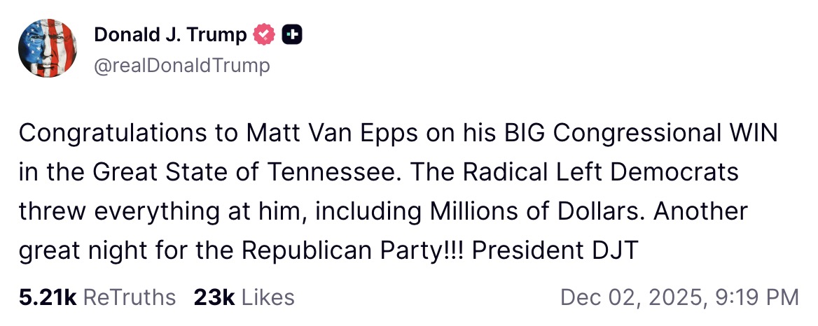 President Donald Trump praised Matt Van Epps’ electoral victory late Tuesday as Republicans held on to a deep-red Tennessee House seat and fended off progressive state lawmaker Aftyn Behn, whom the president fumed “hates Christianity” during the race.