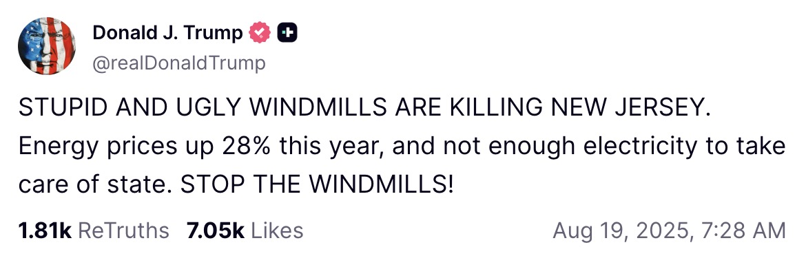 President Donald Trump fumed Tuesday that the “STUPID AND UGLY” wind turbines were “KILLING” New Jersey and blasted the renewable energy project for failing to reduce consumer costs.