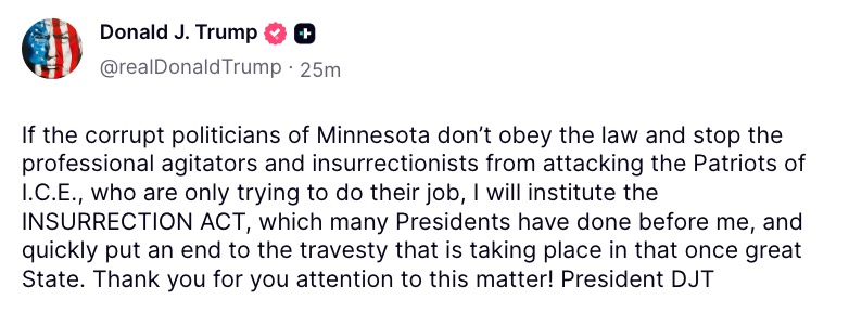 If the corrupt politicians of Minnesota don’t obey the law and stop the professional agitators and insurrectionists from attacking the Patriots of I.C.E., who are only trying to do their job, I will institute the INSURRECTION ACT, which many Presidents have done before me, and quickly put an end to the travesty that is taking place in that once great State. Thank you for you attention to this matter! President DJT