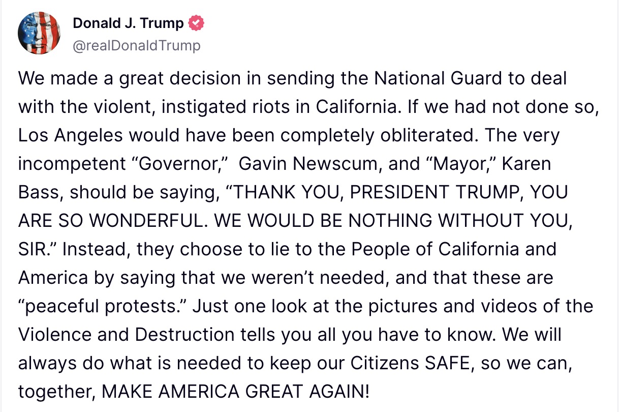 “The very incompetent “Governor,” Gavin Newscum, and “Mayor,” Karen Bass, should be saying, “THANK YOU, PRESIDENT TRUMP, YOU ARE SO WONDERFUL. WE WOULD BE NOTHING WITHOUT YOU, SIR.” Instead, they choose to lie to the People of California and America by saying that we weren’t needed, and that these are “peaceful protests.” Just one look at the pictures and videos of the Violence and Destruction tells you all you have to know. We will always do what is needed to keep our Citizens SAFE, so we can, together, MAKE AMERICA GREAT AGAIN!”