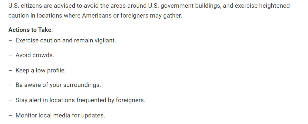 “U.S. citizens are advised to avoid the areas around U.S. government buildings, and exercise heightened caution in locations where Americans or foreigners may gather.”