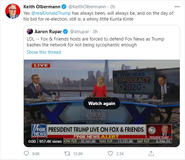 On Tuesday morning, Olbermann posted a clip of Trump bashing Fox News during his lengthy Fox & Friends interview, and captioned the segment “Yes @realDonaldTrump has always been, will always be, and on the day of his bid for re-election, still is: a whiny little Kunta Kinte”.