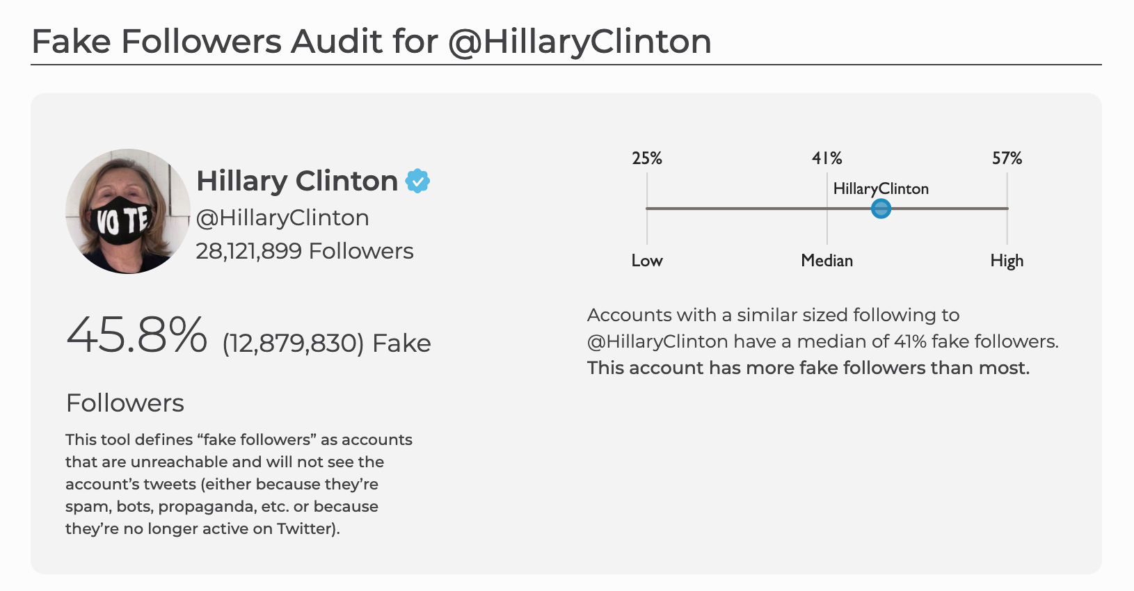 Henry said Trump’s number may be higher for reasons beyond his control. “First, when someone signs up for Twitter, he is one of the first accounts they suggest you follow from my testing. So if Twitter only keeps a small percentage of new accounts active, his number would continue to go up, because the tool considers non-active accounts as ‘fake.’ Secondly, there are a large number of automated accounts or bots that tend to follow and spread his message. We do our best to identify those and add them into the percentage.”