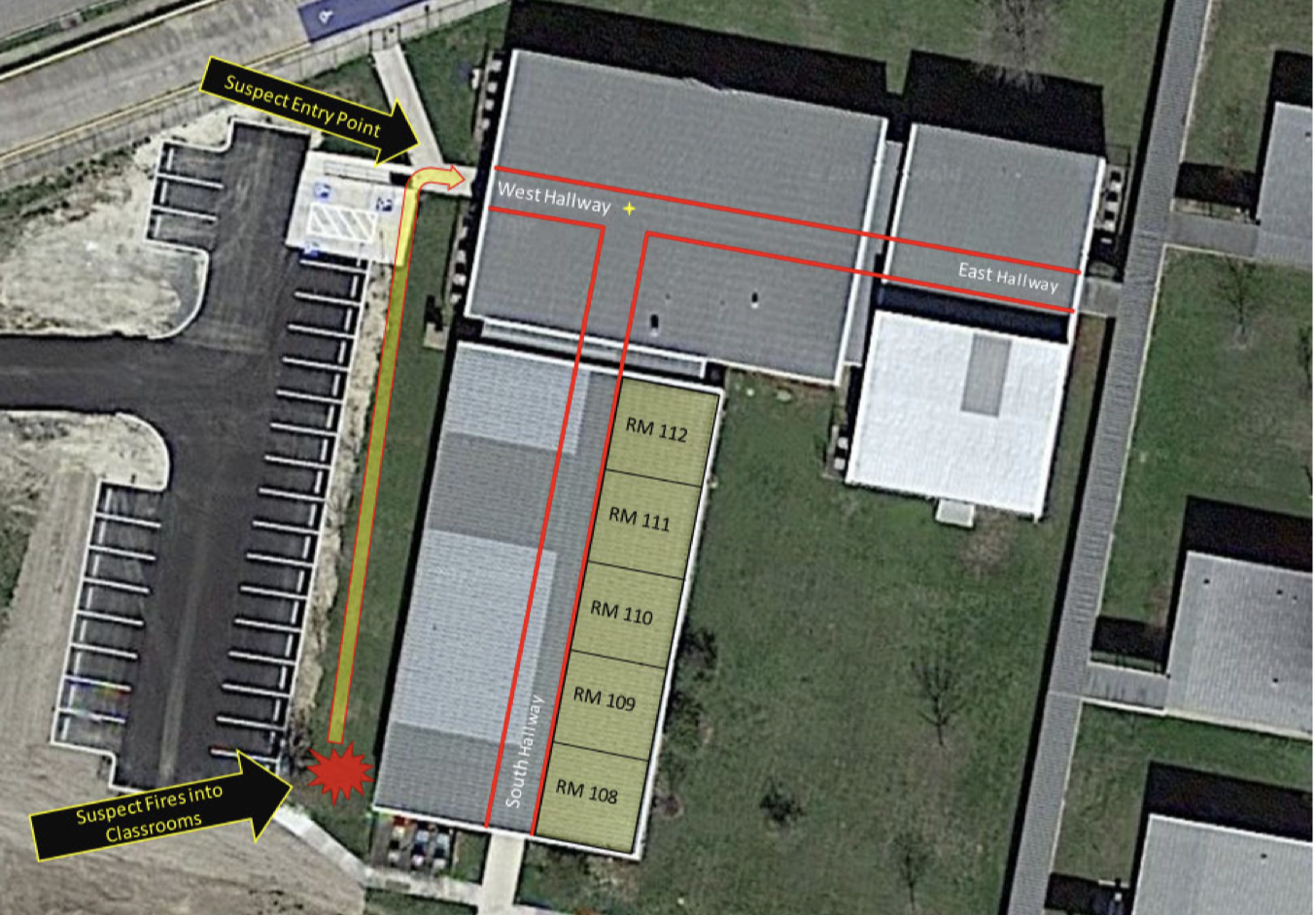 At 11:32:08, the suspect reached the west teachers’ parking lot adjacent to the affected building and fired through windows into the westmost rooms prior to entering the building.