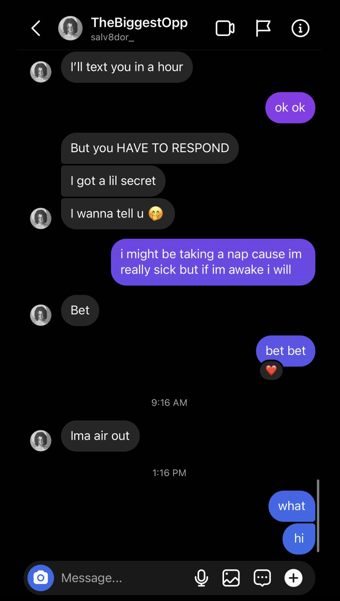 “I’ll text you in a hour… But you HAVE TO RESPOND… I got a lil secret… I wanna tell u,” the messages said. One included a blushing emoji. The woman responded she might be asleep, as she was not feeling well.