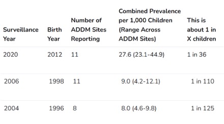 From data readily available from the CDC, about 1 in 36 kids have been diagnosed with some form of autism, but 20 years ago, it was 1 in 125 to 1 in 110 (2004-2006.) From the CDC:
