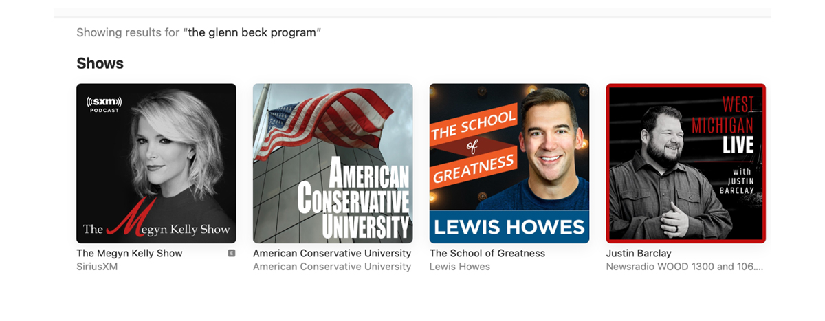 As of 2PM Eastern Time on Wednesday, no search results appear for The Glenn Beck Program when searched on Apple Podcasts.