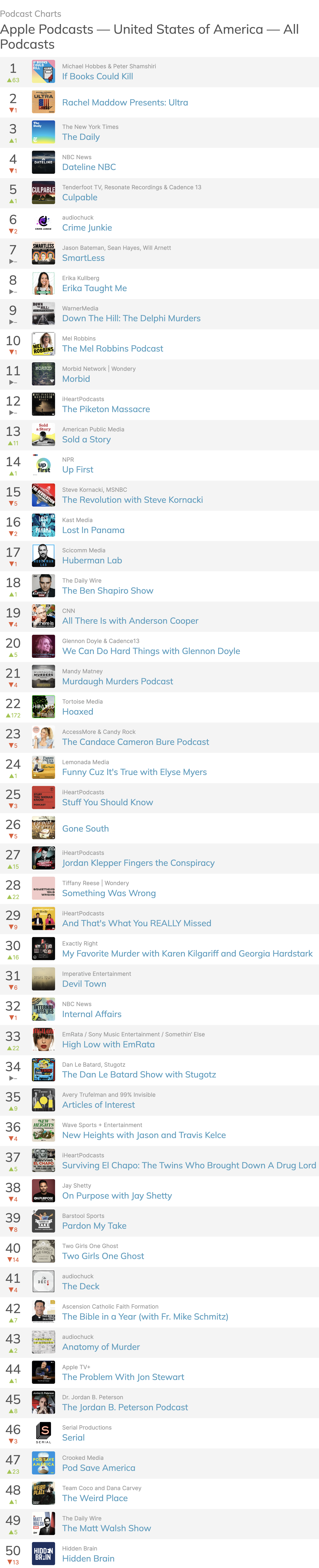 Dethroning Rachel Maddow’s podcast from the top spot is If Books Could Kill hosted by Michael Hobbes & Peter Shamshiri.