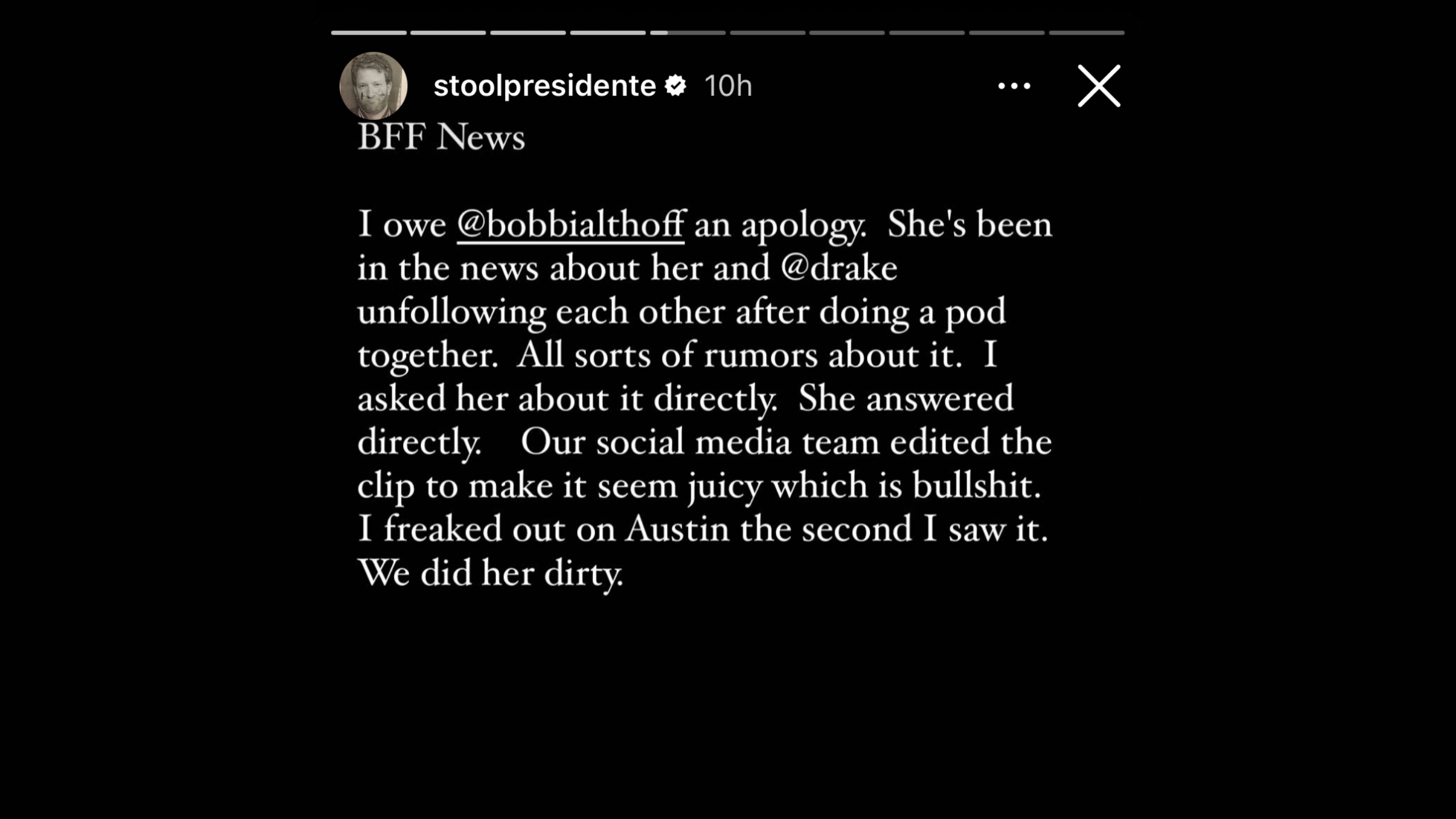 “I owe @bobbialthoff an apology,” Portnoy wrote on his Instagram story. “She’s been in the news about her and @drake unfollowing each other after doing a pod together. All sorts of rumors about it. I asked her about it directly. She answered directly. Our social media team edited the clip to make it seem juicy which is bullshit. I freaked out on Austin the second I saw it. We did her dirty.”
