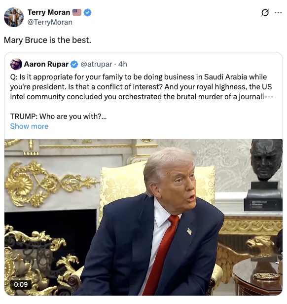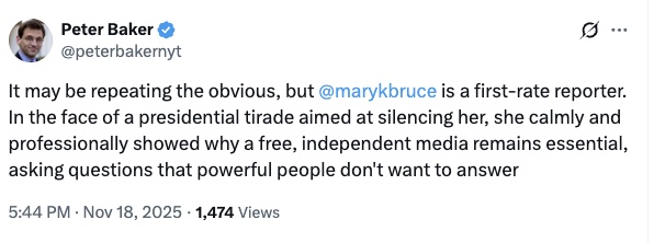 Peter Baker with The New York Times complimented Bruce as a “first-rate reporter.” He added she was calm and professional “in the face of a presidential tirade.”
