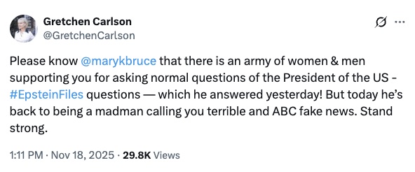 Former Fox News host Gretchen Carlson posted that an “army” of men and women support Bruce. She also said the president acted like a “madman.”