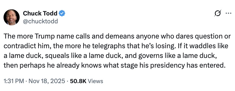 Ex-Meet the Press moderator Chuck Todd said he believed Trump’s comments signaled he was a “lame duck.”