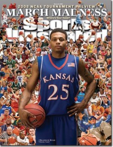 On Sunday the NCAA announced the 65 teams that will play for college basketball’s championship, affording some teams the opportunity of a lifetime while bitterly disappointing others. In recent years, to celebrate the occasion of one of America’s most beloved sporting events, Sports Illustrated has produced annual March-Madness-themed covers that cram in pictures of at least one person from every team in the tournament. View Robert Newman Design’s full March Madness cover gallery here. (At left: March 2008, featuring Kansas’ Brandon Rush. This was one of a series of covers for that year, each featuring a different player as the central figure.)