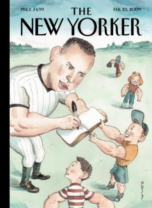 April 4 is Major League Baseball’s opening day, with the World Champion New York Yankees playing the always dangerous Boston Red Sox at 8 pm in Fenway Park. The New York Mets open the following day, with a home game against the Florida Marlins. We’ve dug deep into our archives to present some great baseball magazine covers to celebrate the start of the season. (Cover at left: The New Yorker, February 23, 2009, illustration by Barry Blitt. The illustration features three-time American League MVP New York Yankee third baseman Alex “A-Rod” Rodriguez, who in 2009 admitted to using steroids as a player during the years 2001-2003.)