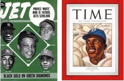 Left: Jet, April 26, 1962. “Black Gold on Green Diamonds” features five African American baseball stars: New York Yankees catcher Elston Howard (1963 American League MVP, first black player on the Yankees); Chicago White Sox left fielder Saturnino Orestes Armas “Minnie” Minoso, (“The Cuban Comet,” first black player on the White Sox, he led the league in getting hit by pitches 10 times); Chicago Cubs left fielder Billy Williams (“Sweet Billy” was the 1961 Rookie of the Year); Los Angeles Dodger infielder Jim Gilliam (1953 Rookie of the Year), and New York Giants centerfielder Willie Mays, the Say Hey Kid (1951 Rookie of the Year, two-time MVP, and the man many consider to be the greatest all-around player of all time).