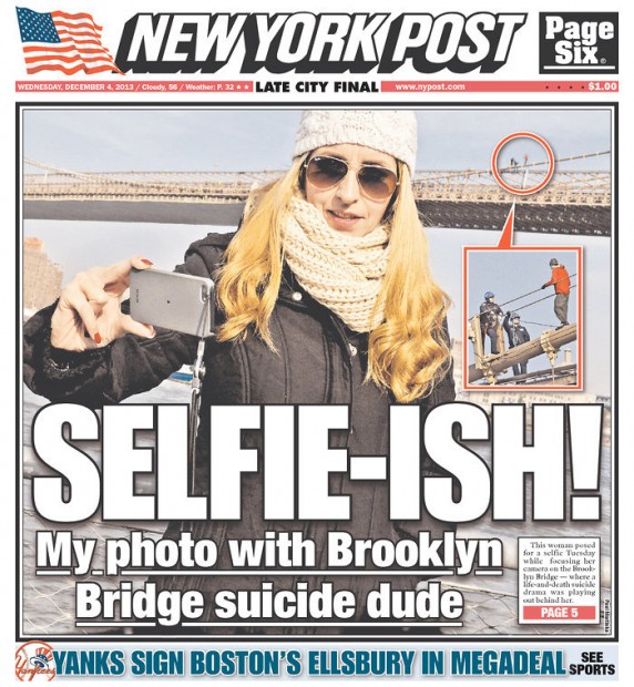 What’s even worse that “funeral selfies”? How about obliviously taking a photo of yourself while someone attempts to jump off the Brooklyn Bridge in the background. One woman apparently did just that and ended up on the front page of the New York Post along with the headline “SELFIE-ISH!”