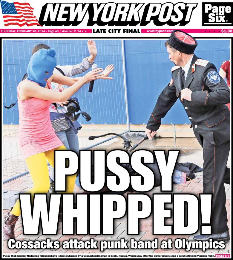 Proving, yet again, that there’s no act so violent that it can’t be dismissed as a lark with a galumphing pun, the New York Post featured the recent story about Russian protest group Pussy Riot being beaten and pepper-sprayed in Sochi on the cover of their late edition on Wednesday under the headline “Pussy Whipped!”