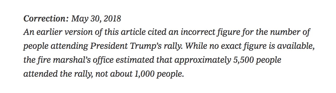 President @realDonaldTrump is correct about his crowd last night. My estimate was way off, and we have corrected our story to reflect the fire marshal’s estimate of 5,500 people. When we get it wrong, we say so. https://t.co/AX2JkAMyh4 https://t.co/2LbfmkiSti