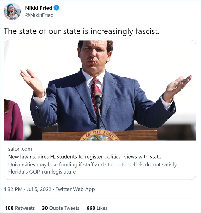 The 2021 law does require public colleges and universities in Florida to administer annual surveys on the subject of “intellectual freedom and viewpoint diversity.” But contrary to the inaccurate initial Salon headline, the law does not require anybody to register their political views. Students and faculty members can decide whether to participate in the surveys, which are anonymous.