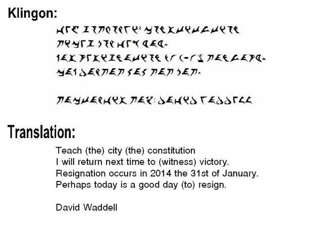 City councilman, plumber, and self-announced candidate for US Senate David Waddell announced his resignation from the board of Indian Trail, NC, using the words of patriots — specifically, the words from the fictional Star Trek language of Klingon.