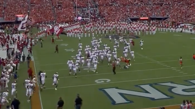 But one Sooner was on the receiving end of a physical hit before kickoff, and surprisingly not from a member of the Auburn football team.
