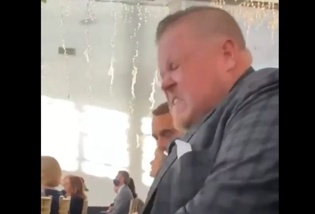 The clip of this visibly elated yet trying to restrain himself wedding attendee gained traction on social media after being posted by Barstool Sports:
