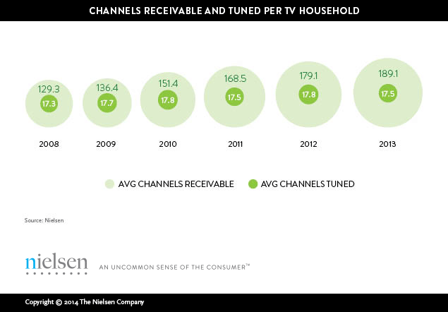 The average American home now receives 189 channels, a record high in human history. Yet despite that plethora of choice for television viewing enjoyment, Nielsen found that American consumers still only tune in to an average of just 17 channels. And that number has remained the same since 2008.