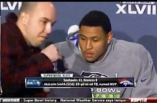 New Jersey resident Matthew Mills, 30, stormed the dais during Sunday evening’s presser with MVP Malcolm Smith, grabbed the mic and implored the media to investigate the 9/11 attacks because, he believes, they were “perpetrated by people within our own government.”