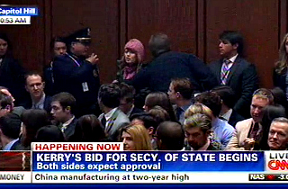 While Sen. John Kerry‘s testified at his hearing to be confirmed for Secretary of State, an anti-war protestor interrupted the proceedings to protest American involvement in the Middle East. Following her being escorted out of the building, Sen. Kerry defused the tension by expressing respect for the heckler’s concerns.