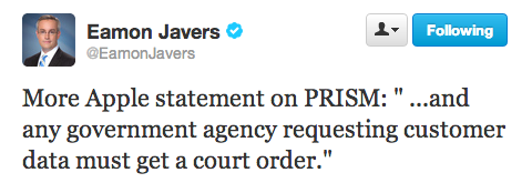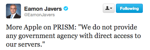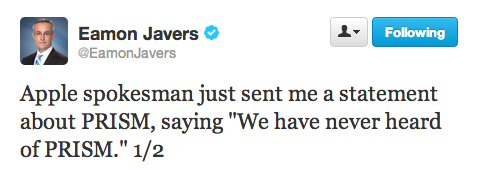 CNBC’s Eamon Javers was the first to announce the statement from Apple, who reportedly told them the company has “never heard of PRISM.”
