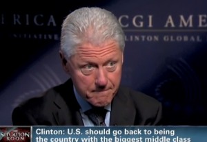 Clinton also wanted it to be clear that if you raise taxes “you’re not anti-business.” He suggested “what our goal should be – to go back to being the country with the biggest middle class in the world and broadly shared.” Blitzer recited one Republican argument against raising taxes, since the top 2% of Americans already pay much of the federal income tax, while half of the people in America pay no income tax. Clinton responded that’s exactly the way it should be, especially because “the top 1% also got 43% of the income gains in the last decade.”
