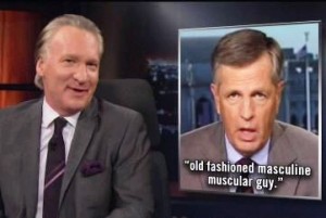 Maher trashed all the “non-serving chicken hawks [who] see themselves as the tough guys” when really, he said, they have all the bluster of a “blogger in his bathrobe.” He said Republicans have gone from Teddy Roosevelt‘s “speak softly and carry a big stick” to Chris Christie‘s “speak loudly and be a big dick.”