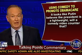As anyone could have expected after watching Fox News today, Bill O’Reilly opened his show with a take down of President Barack Obama’s appearance on Funny or Die’s Between Two Ferns with Zach Galifianakis. “Using a comedic web site to enroll people is a little bit desperate, don’t you think?” he asked.