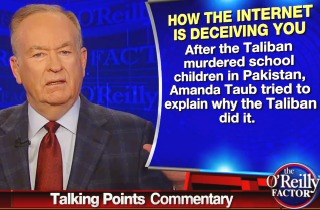 O’Reilly was basing that conclusion off of this piece from Taub (from a month ago, for the record) on why the Pakistani Taliban murdered more than 100 schoolchildren. Taub providing her perspective into the mindset of why the Taliban would have carried out the horrible attack was, to O’Reilly, beyond disgusting and “providing a rationale” for that slaughter.