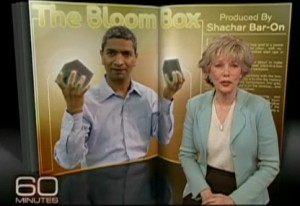 On 60 Minutes tonight a brand new energy company unveiled what was billed as a potentially revolutionary energy technology called Bloom Boxes. Based on fuel-cell technologies, Stahl unveiled the formerly secret company Bloom Energy thusly: “The idea is to one day replace the big power plants and transmission line grid, the way the laptop moved in on the desktop and cell phones supplanted landlines.”
