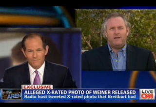 Before it was somehow eclipsed by the stranger-than-fiction reality that the Congressman’s wife is pregnant, the extremely graphic photo of the Congressman’s genitals was by far the top news of the day, less than 24 hours after Breitbart promised not to release it. And, he told Spitzer, he didn’t break that promise. “If you listen further in the video,” Breitbart tells Spitzer, “[show co-host] Jim Norton assures me that there are no cameras.” He explains that he needed to show the photo because it was proof, and that the radio hosts themselves “admitted that they took this photo surrepticiously.”