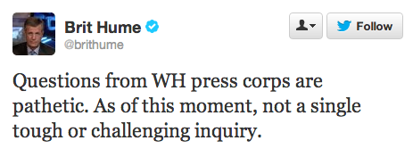 Earlier in the day, Hume fired off a series of tweets slamming the lack of challenging questions at the presser.