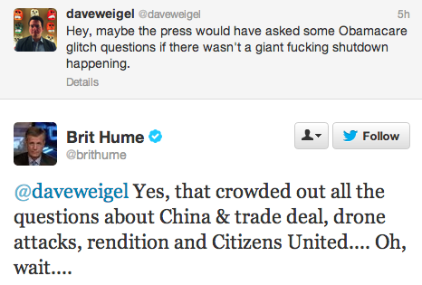 Hume said this was “obviously deliberate,” adding that no one asked a thing about the Obamacare roll-out or challenged him on his debt ceiling remarks.