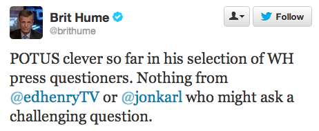 Fox News’ Brit Hume was bewildered at the complete lack of hard-hitting questions at President Obama‘s press conference on Tuesday, calling out Obama for ignoring the network TV correspondents because, as Hume saw it, they are traditionally tougher on presidents than other journalists.
