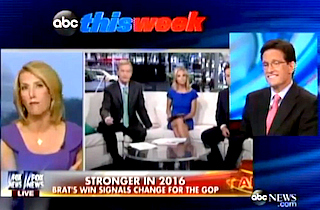 On This Week with George Stephanopoulos, ABC News White House Correspondent Jon Karl played for outgoing House Majority Leader Eric Cantor (R-VA) a clip of fellow ABC News-er Laura Ingraham calling Cantor a “phony” in the wake of his loss, and asked for Cantor’s response to her criticism, which included the soundbite that he should have been traded to the Taliban.
