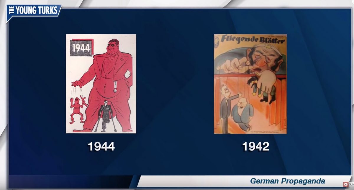 Uygur went on to describe Carlson’s segment as an, “over the top counterattack,” and showed a comparison of ‘The Zucker Puppet’ graphic to propaganda from 1940s Germany of a Jewish puppet master. He then showed two posters from 1940’s Germany that also featured Jewish puppet imagery”