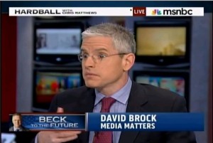 Matthews, likely pleased that his time slot rival would soon be gone, asked Brock what led to the parting of ways between Beck and Fox? Brock explained that it was a result of the content of Beck’s show, which he said was filled with race-baiting and apocalyptic rhetoric. Also Brock claimed Beck lost more than 300 major advertisers and attempted to incite violence against progressives. Matthews summarized Beck’s commentary as “precious bodily fluids” and as “insane talk.”