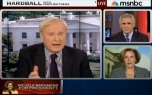 Matthews heaped an unusual amount of praise on Bachmann, suggesting she has “pizzazz” and “travels better than Sarah Palin.” Furthermore, Matthews believed that to her credit, “Bachmann is much more on the attack and not playing defense” like Palin. Matthews felt that Bachmann captures the “zest” of the right possibly like no one else, and even Walsh ended up reluctantly agreeing that Bachmann seems to now be “in the mainstream of Republican politics.”