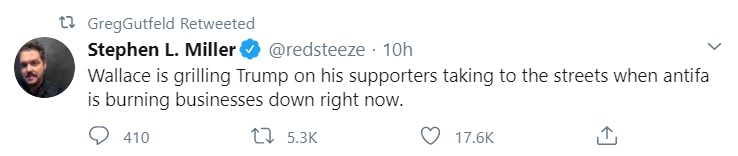 Gutfeld also called the entire debate “not good,” and retweeted a post from Miller claiming, “Wallace is grilling Trump on his supporters taking to the streets when antifa is burning businesses down right now.”