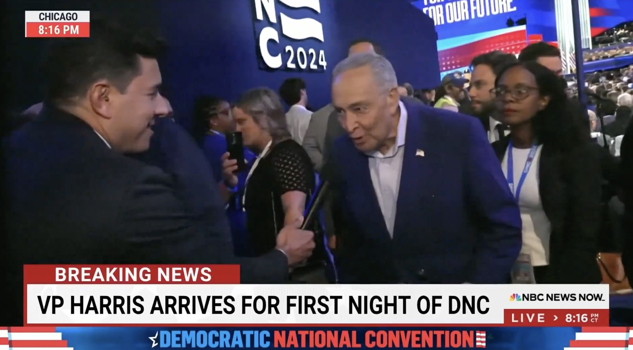 During an interview with Schumer on the convention floor, NBC News NOW anchor Tom Llamas asked, “What’s your message to former President Trump tonight?”