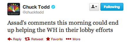 MSNBC Chief Political Analyst Chuck Todd quickly reacted to excerpts of Charlie Rose’s interview with Bashar al-Assad, saying the Syrian President’s threats of retaliation against a U.S. strike, and overall efforts to dissuade lawmakers from authorizing military action, would backfire into congressional support for U.S. intervention.